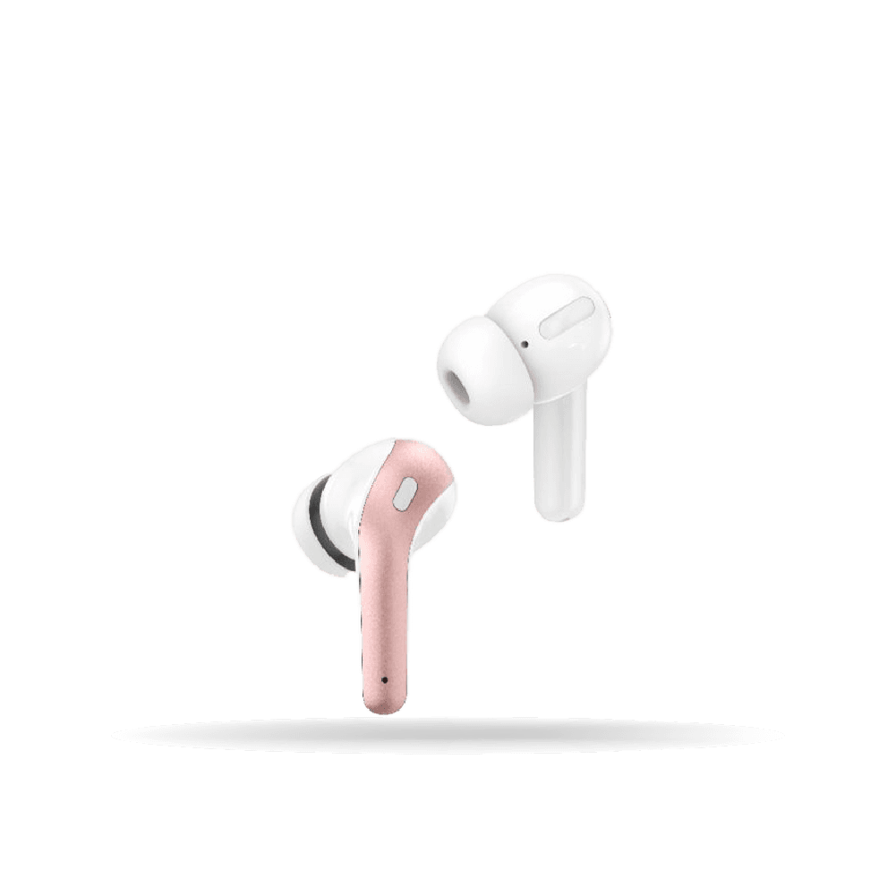 Con un acabado en color Golden Rose, destacan por su estilo moderno y atractivo. Su diseño ergonómico se ajusta cómodamente al oído, permitiendo usarlos durante largos periodos sin incomodidad.