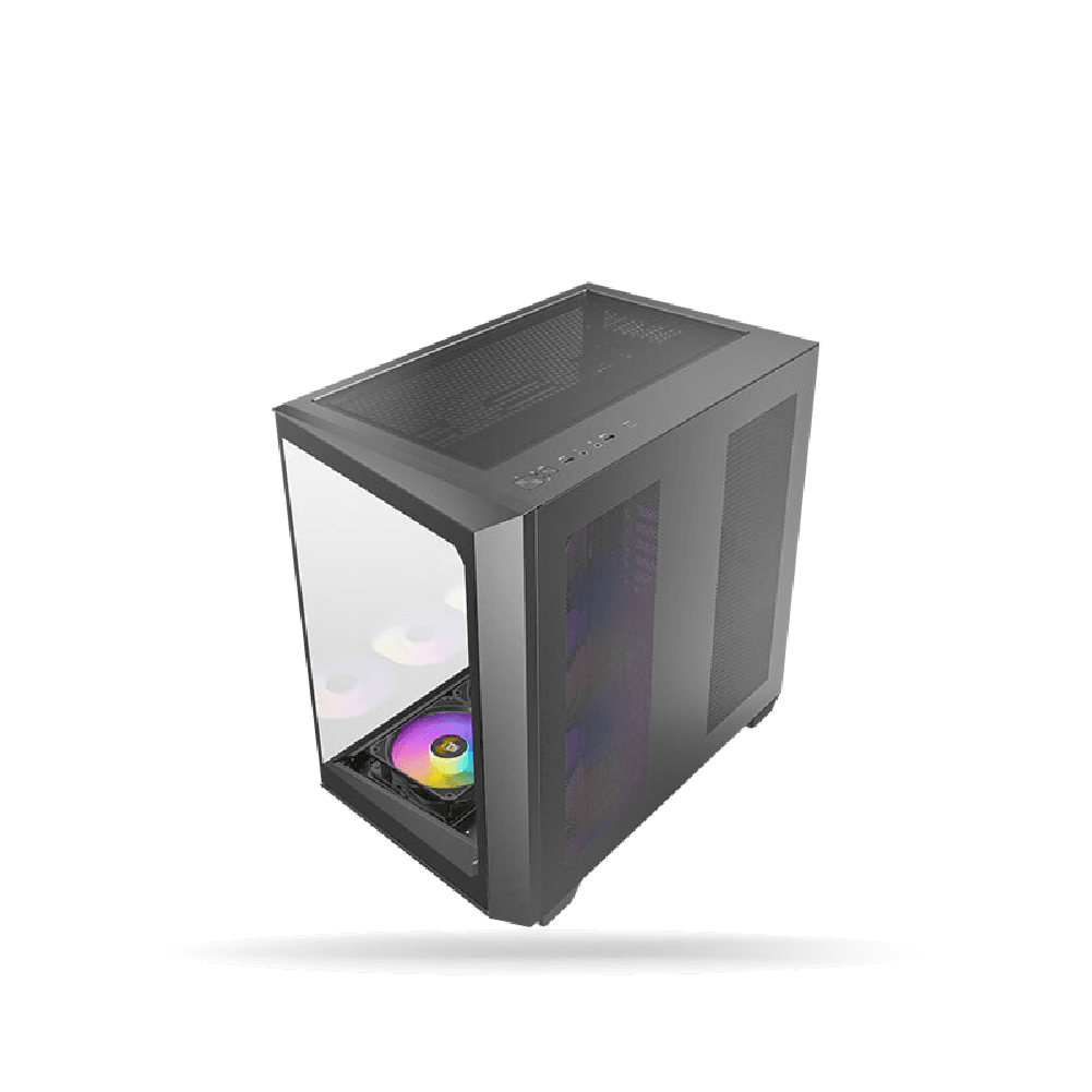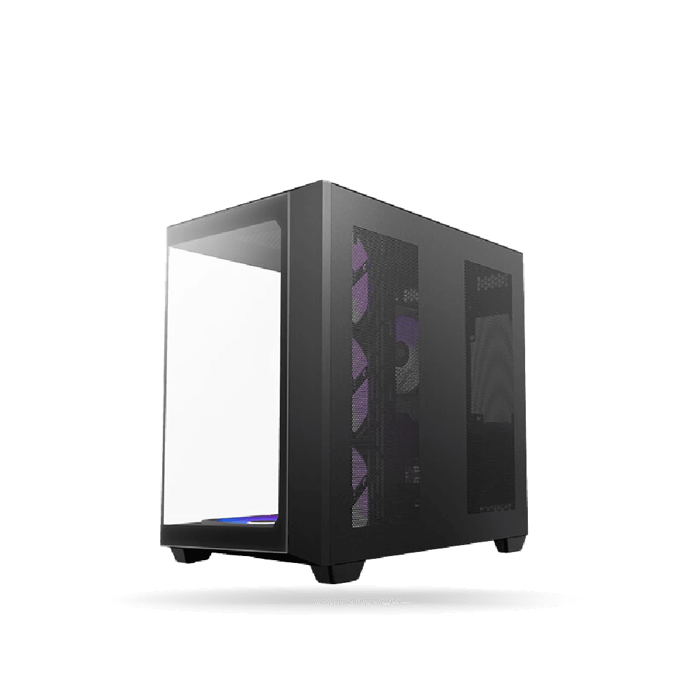 Su acabado en color negro con panel lateral permite visualizar los componentes internos, aportando un look moderno y atractivo.