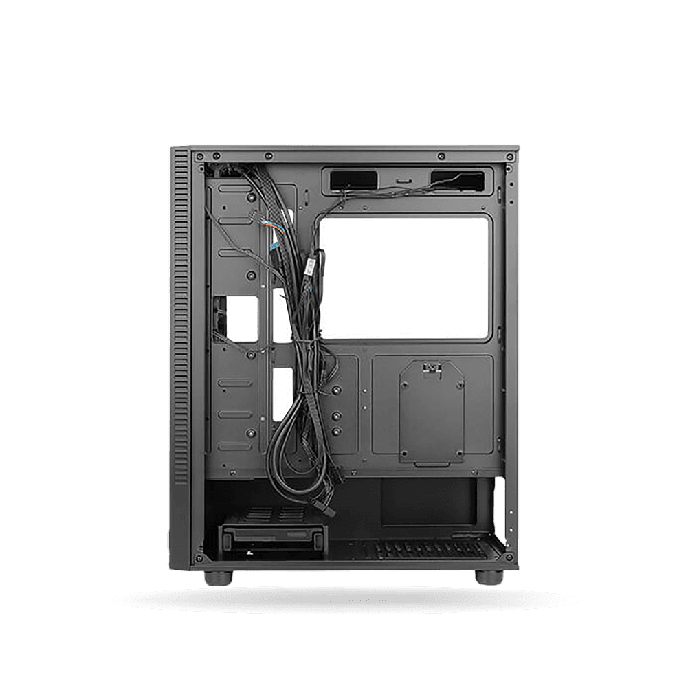 El chasis incluye bahías para discos duros y SSD, filtros antipolvo y un diseño interno que facilita la instalación rápida de todos los componentes. La gestión del cableado es sencilla gracias al espacio dedicado para ocultar cables, logrando un acabado limpio y ordenado.