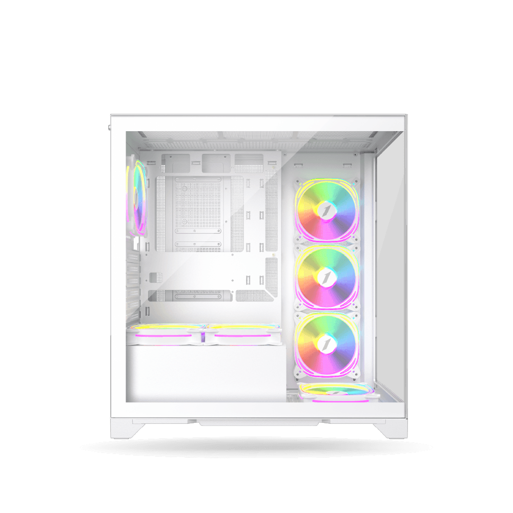 Incluye 4 ventiladores ARGB estratégicamente ubicados para optimizar el flujo de aire y mantener bajas temperaturas incluso durante largas sesiones de juego o trabajo intensivo. Además, cuenta con espacio para añadir más ventiladores o sistemas de refrigeración líquida para una ventilación personalizada.