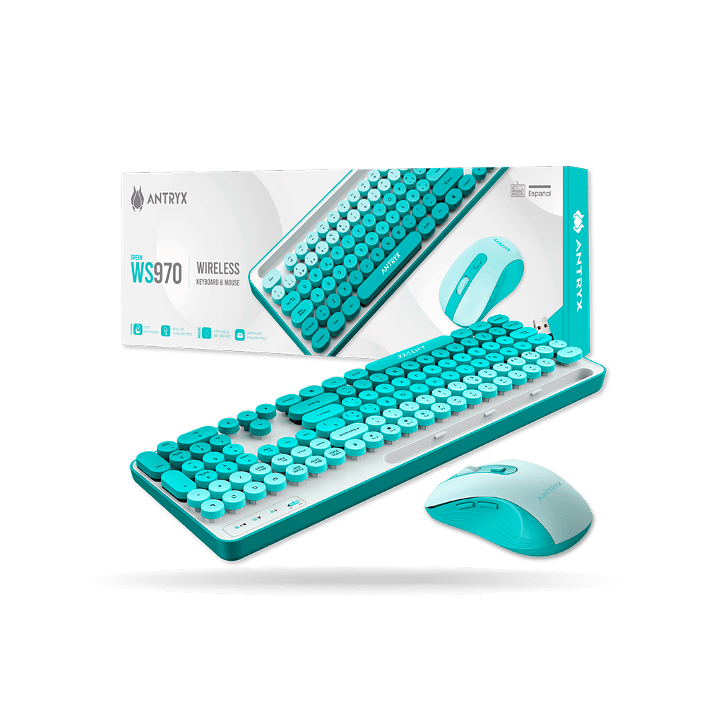El kit inalámbrico ANTRYX WS-970 Green incluye teclado y mouse diseñados para ofrecer una experiencia cómoda y eficiente en tareas diarias. Su respuesta precisa y uso intuitivo lo hacen ideal para oficina, estudio o el hogar.