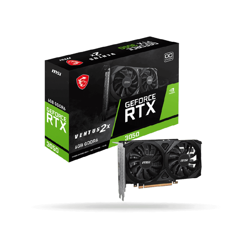 La Tarjeta de Video MSI GeForce RTX 3050 VENTUS 2X 6G OC ofrece un excelente rendimiento para usuarios que desean dar el salto a la experiencia RTX sin comprometer el presupuesto. Basada en la arquitectura Ampere de NVIDIA, esta GPU de 6GB GDDR6 combina trazado de rayos en tiempo real y tecnologías de inteligencia artificial con eficiencia y velocidad.